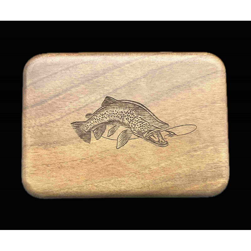 Dřevěná krabička značky Na mušku s obrázkem pstruha obecného.