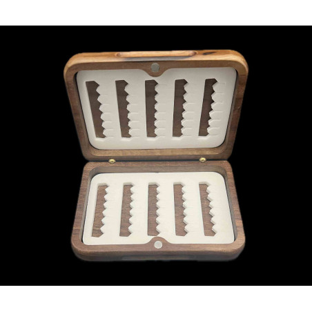 1) Materiál používaný pro výrobu dřevěných muškařských krabiček je výhradně ořechové dřevo, které roste na skalnatém terénu ve výšce přes 500 m nad mořem - tyto podmínky jej dělají super pevným a dávají mu jedinečnou texturu.
