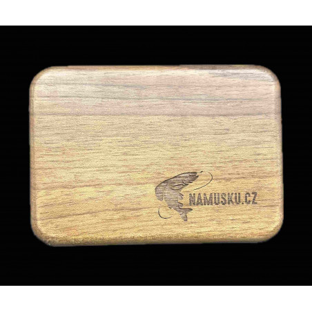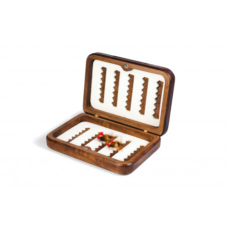 Dřevěná krabička s mikrozářezy na 35 mušek na každé straně, celkem tedy na 70 mušek.